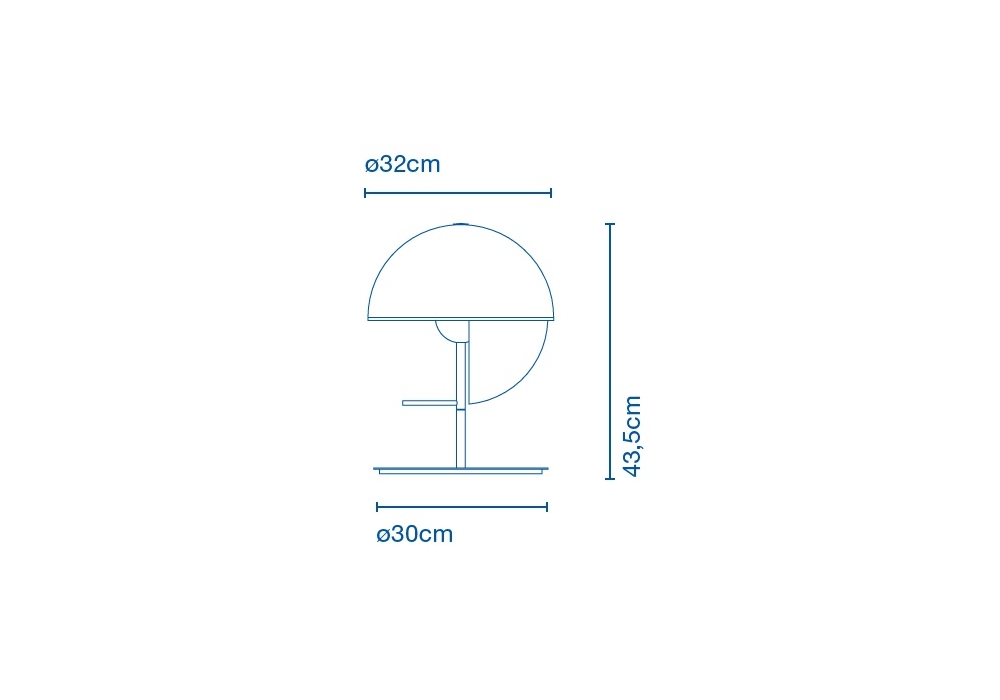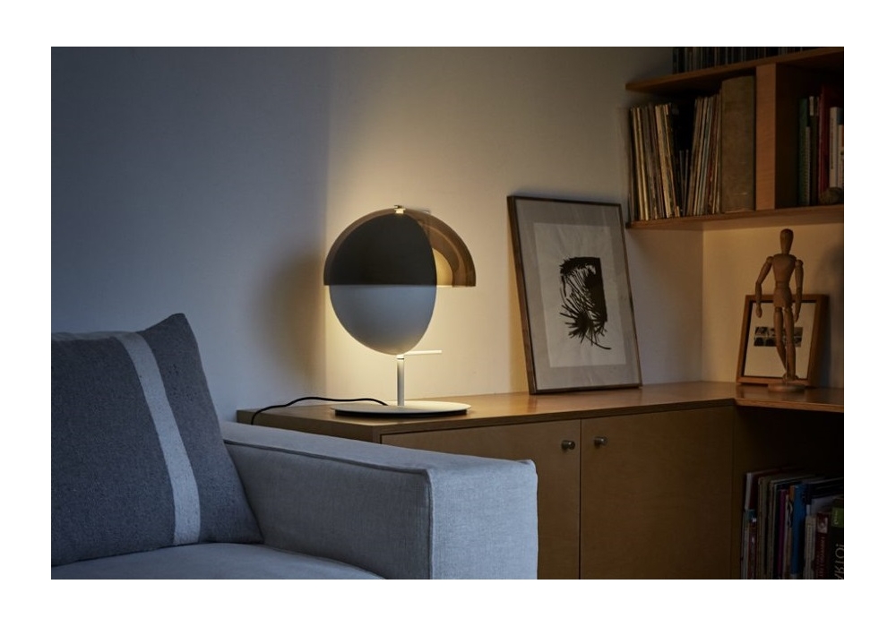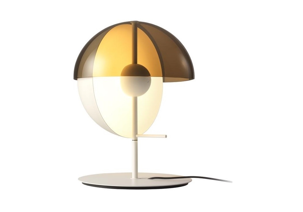 Theia M firmata da Mathias Hahn per Marset è una lampada da tavolo con base e stelo in ferro laccato. Diffusore in alluminio laccato con interruttore incorporato. Semi-sfera verticale in metallo laccato con interno bianco e paralume in metacrilato termoformato trasparente fumé. Disponibile anche in 2 diverse finiture: bianco o nero.