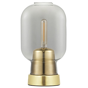 Amp firmata da Simon Legald per Normann Copenhagen è una lampada da tavolo, con base circolare in ottone . Il paralume è in vetro, di forma cilindrica svasata nelle finiture fumè o bianco, e scherma una sorgente luminosa LED ( non inclusa ). Amp è disponibile in versione EU (Europa) o US (U.S.A).