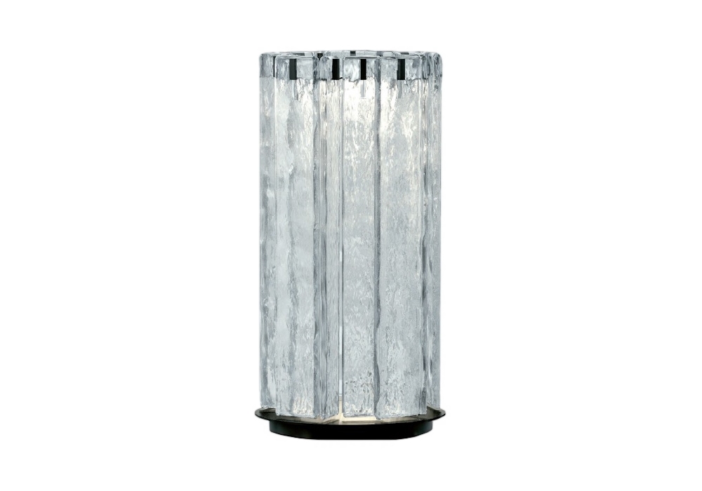 Swords firmata da Giancarlo Bosio & Centro Ricerche Giorgetti è una lampada da tavolo con base in metallo brunito che sostiene lastre in vetro colato a forte spessore con superficie martellata. Disponibile in vetro trasparente o fumé. Illuminazione LED dimmerabile.
