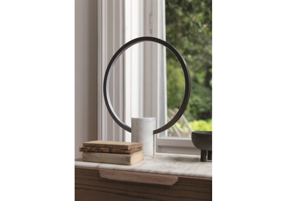 Halo firmata da D. Dolcini per Porada è una lampada da tavolo a LED dimmerabile. Struttura circolare in metallo verniciato color peltro. Base cilindrica in marmo bianco di Carrara. Disponibile in due dimensioni.