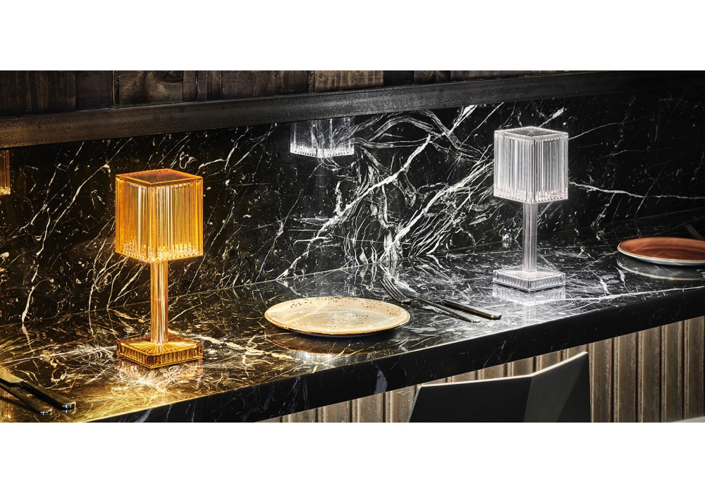 Gatsby Prisma firmata da Ramón Esteve per Vondom è una lampada da tavolo realizzata in vetro disponibile in 3 finiture. La sua intensità luminosa regolabile e la possibilità di scegliere il colore proiettato fanno di Gatsby la lampada perfetta per creare un'atmosfera straordinaria. Illuminazione LED.