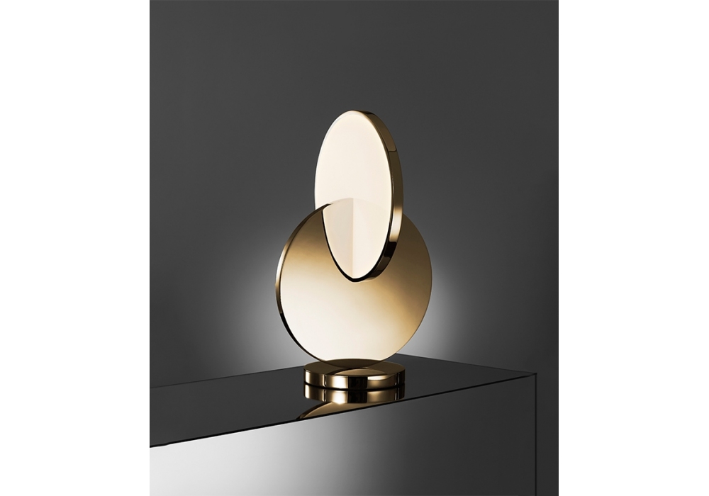 Eclipse Gold prodotta e firmata da Lee Broom è una lampada da tavolo composta da due dischi contrapposti in oro lucidato a specchio e diffusore in acrilico opalino. La sorgente luminosa è di tipo LED dimmerabile.