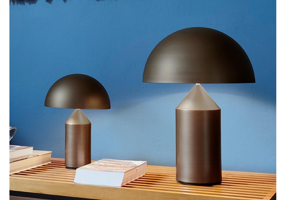 Atollo Bronze firmata da Vico Magistretti per Oluce è una lampada da tavolo interamente realizzata in metallo di colore bronzo. Il diffusore ha una forma a cupola e scherma una sorgente luminosa. Atollo Bronze è disponibile in differenti dimensioni.