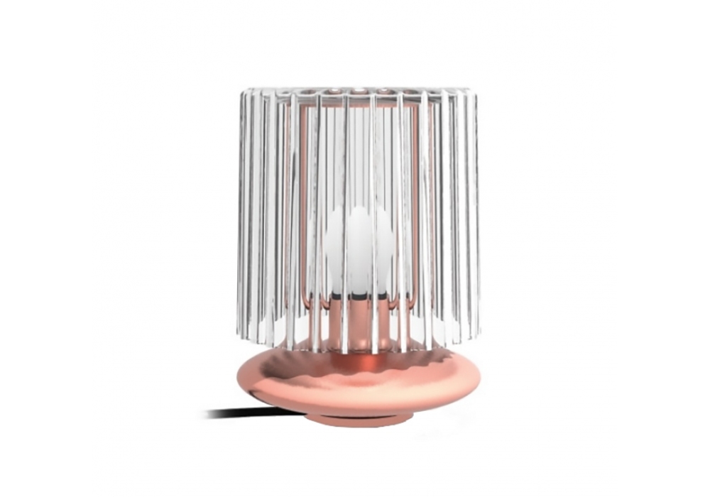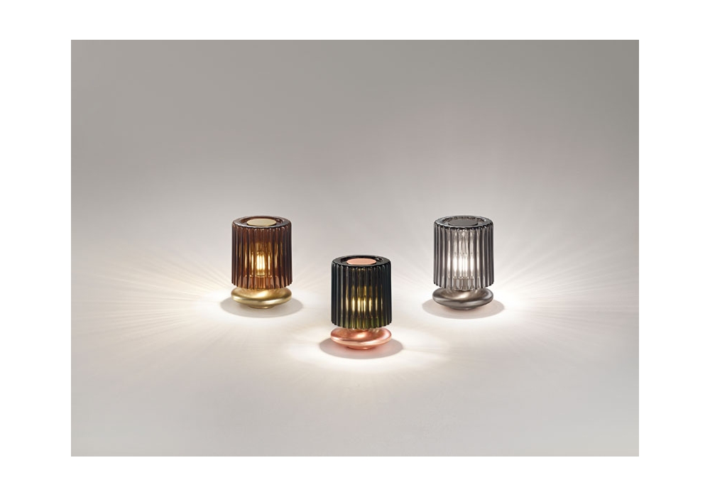 Tread firmata da Chiaramonte e Marin per Vistosi è una lampada da tavolo con struttura portante in metallo verniciato. Il diffusore è in vetro di forma cilindrica con superficie rigata e scherma una sorgente luminosa con innesto E14 di tipo LED o alogena. Tread è disponibile in differenti finiture.