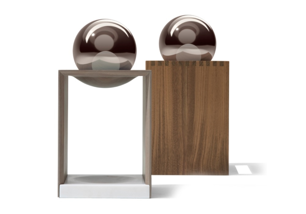 Spaziotempo designed for Carlo Colombo for Giorgetti è una lampada da tavolo con struttura in noce canaletto, basamento in marmo Calacatta oro e diffusore sferico in vetro.