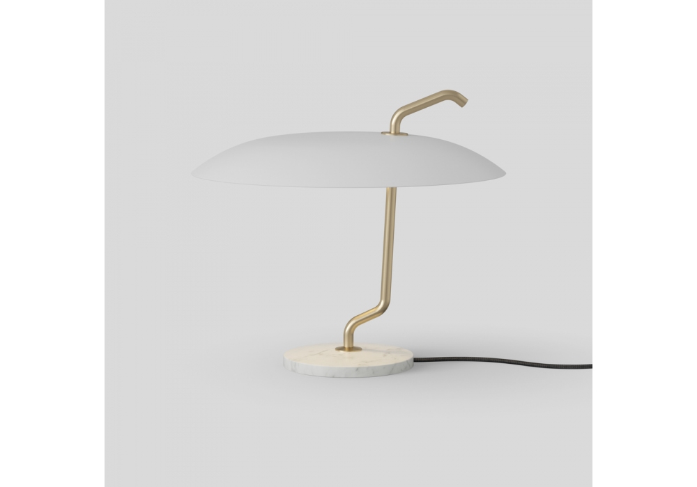 Model 537 firmata da Gino Sarfatti per Astep è una lampada da tavolo con struttura in ottone (opaco o nero), diffusore in alluminio bianco o nero, e base in marmo bianco o nero.