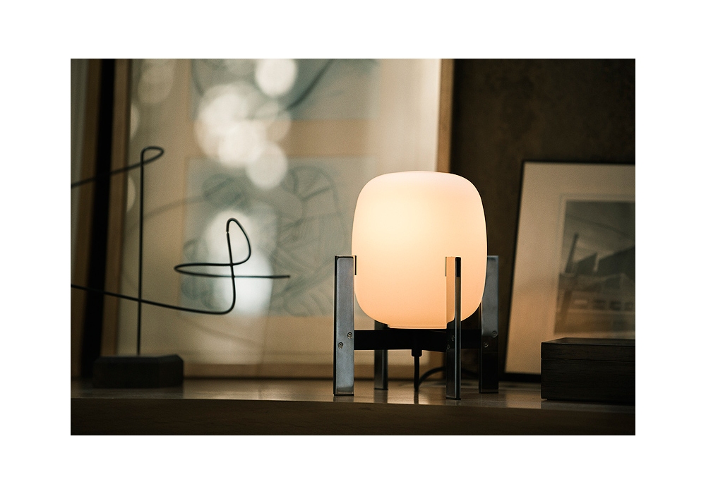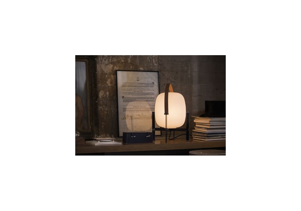 Cesta Metalica firmata da Miguel Milá per Santa&Cole è una lampada da tavolo con diffusore bianco opale. Disponibile anche con manico in pelle.