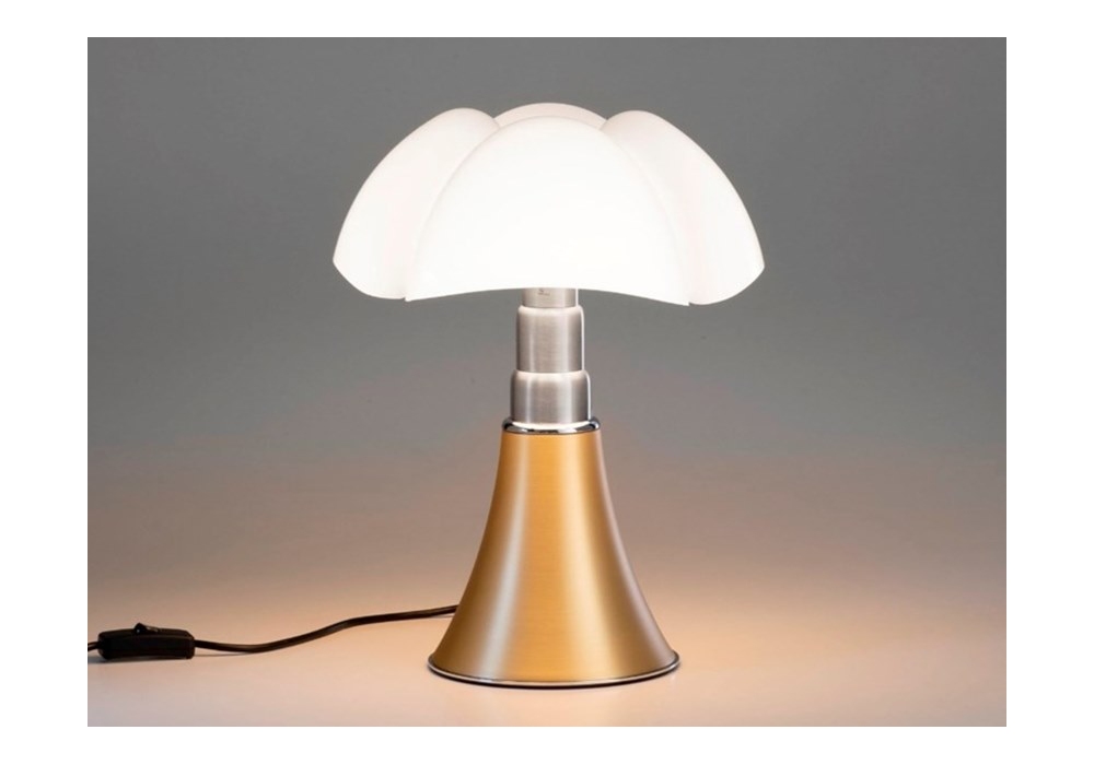 Minipipistrello firmata da Gae Aulenti per Martinelli Luce è una lampada da tavolo con braccio centrale telescopico in acciaio inox e base in metallo verniciato. Il diffusore è in metacrilato opalino bianco e scherma una sorgente luminosa di tipo LED integrato dimmerabile. Minipipistrello è disponibile in differenti finiture.