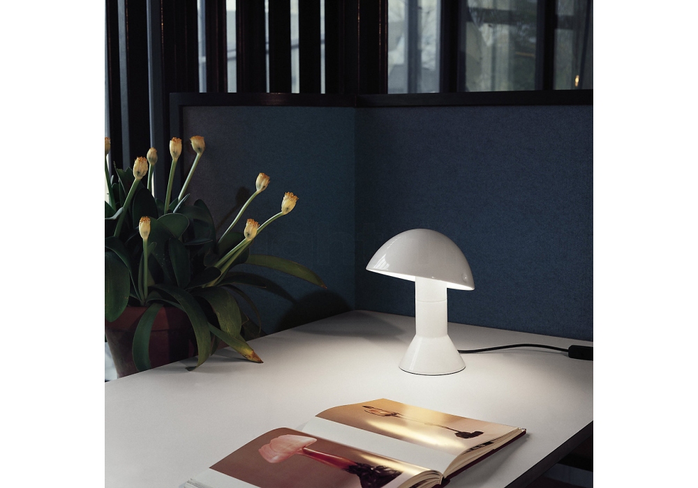 Elmetto firmata da Elio Martinelli per Martinelli Luce è una lampada da tavolo interamente strutturata in resina. Il riflettore a cupola è orientabile e scherma una sorgente luminosa di tipo LED. Elmetto è disponibile in differenti finiture.