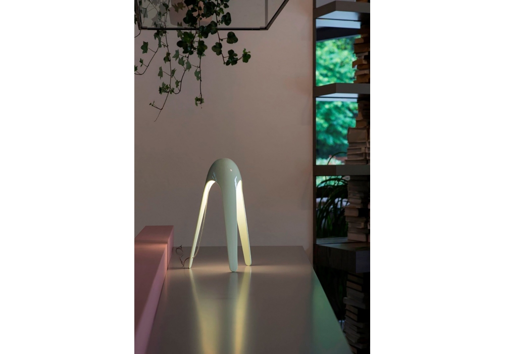 Cyborg firmata da Karim Rashid per Martinelli Luce è una lampada da tavolo strutturata interamente in alluminio verniciato in differenti finiture. Il diffusore è in policarbonato opale bianco e scherma una sorgente luminosa di tipo LED integrato con sensore di accensione/spegnimento soft touch.
