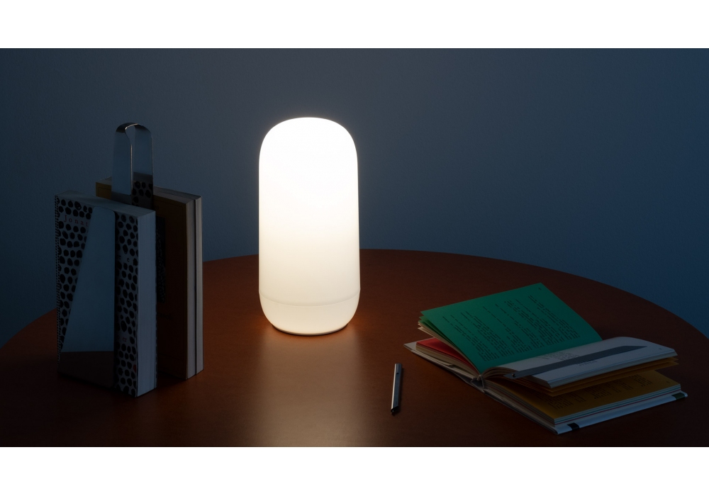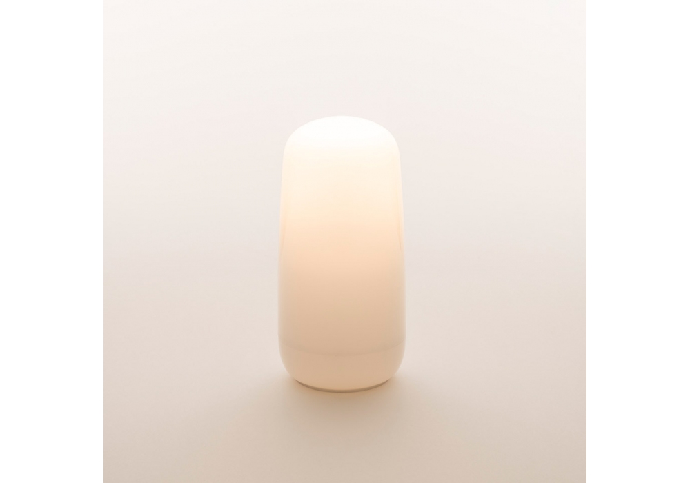 Gople White firmata da BIG - Bjarke Ingels Group per Artemide è una lampada da tavolo a LED, con diffusore in vetro soffiato bianco e struttura interna in alluminio e metacrilato. La lampada è disponibile in due modelli: Portable e Plug.