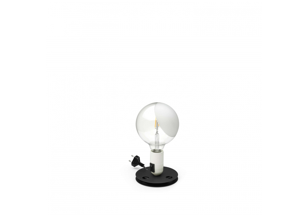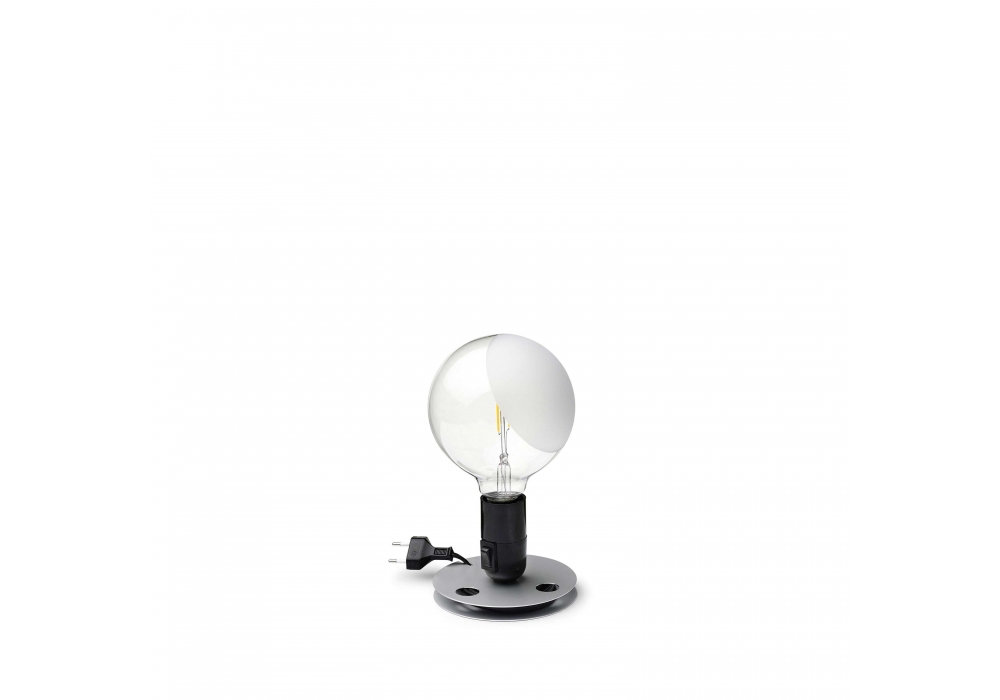 Lampadina firmata da Achille Castiglioni per Flos è una lampada da tavolo a luce diretta/diffusa. Base in alluminio anodizzato, avente anche la funzione di riavvolgitore del cavo elettrico. Porta lampadina in bachelite e, per il colore arancio, con verniciatura a liquido. Lampadina globolux vetro trasparente con una parziale sabbiatura su un lato della sfera. Interruttore integrato (non regolabile). Fonte luminosa inclusa.