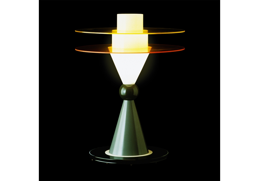Bay firmata da Ettore Sottsass per Memphis Milano è una lampada da tavolo realizzata in vetro, metallo e Perspex.