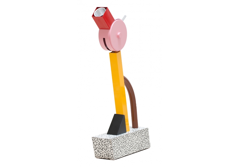 Tahiti firmata da Ettore Sottsass per Memphis Milano è una lampada da tavolo realizzata con testa girevole in metallo smaltato policromo su base in laminato plastico con pattern Bacterio bianco e nero. Lampadina a Led versione EU 230V.