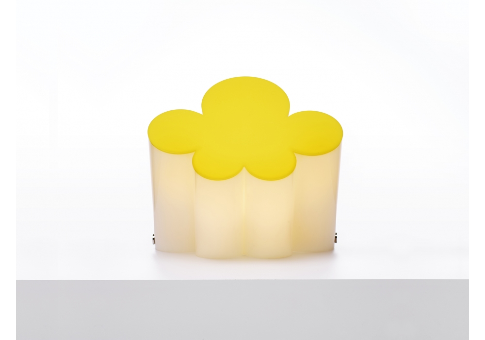 Passiflora firmata da Superstudio per Poltronova è una lampada da tavolo realizzata in Perspex® tagliato e termoformato. Corpo bianco opalino e fiore interno giallo.