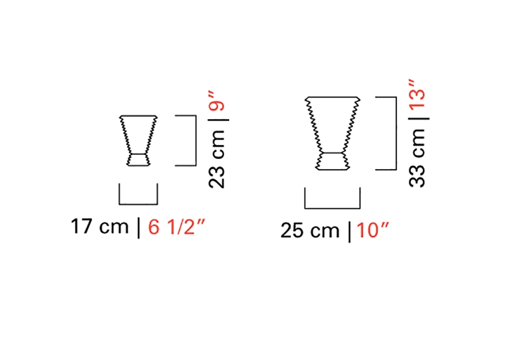 | Dimensioni | Ø 17 x H 23 cm; Ø 25 x H 33 cm. |
