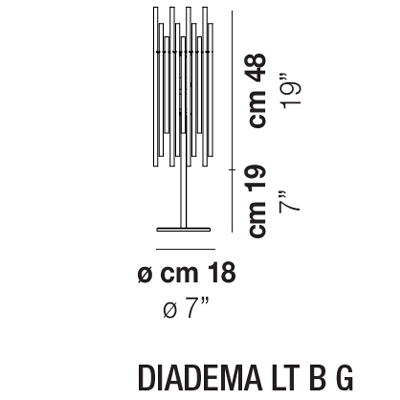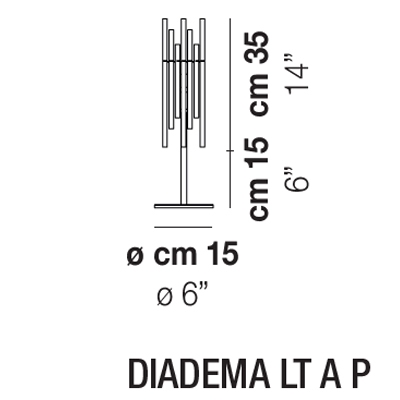 Diadema firmata da Romani Saccani Architetti Associati per Vistosi è una lampada da tavolo con base circolare ed asta verticale in metallo verniciato. Il diffusore è strutturato da una serie di elementi tubolari in cristallo accostati l'uno all'altro e schermano una sorgente luminosa con innesto G9 di tipo LED o alogeno. Diadema è disponibile in differenti modelli e finiture.