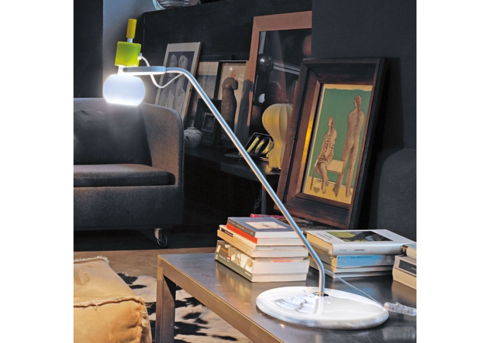 Vega firmata da Michele De Lucchi per Vistosi è una lampada da tavolo con base circolare e asta tubolare in metallo verniciato bianco lucido. Il diffusore è in vetro dalla forma sferica ed adotta una sorgente luminosa con innesto G9 di tipo LED o alogena dimmerabile. Vega è disponibile in differenti finiture.