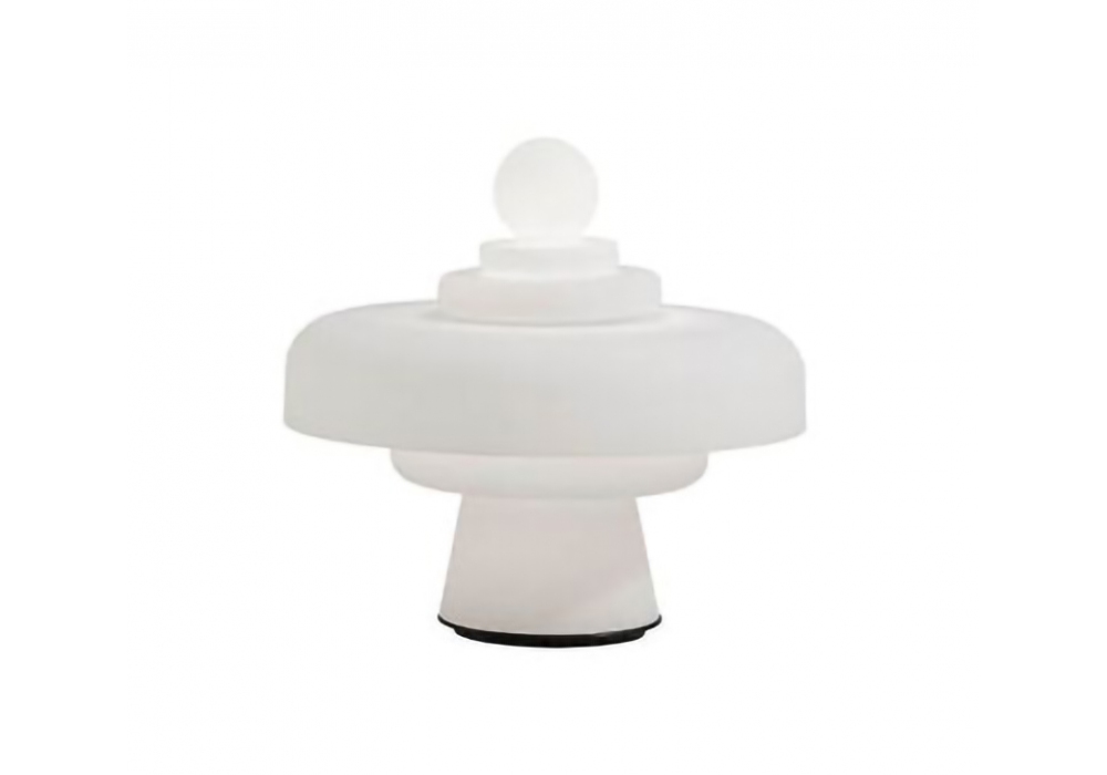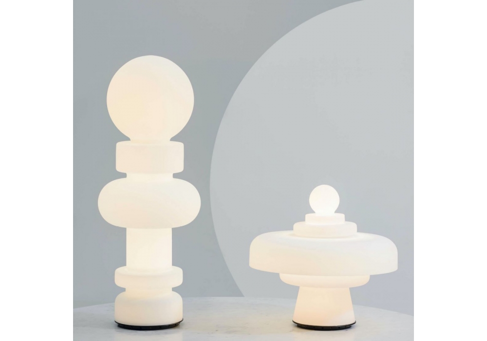 Regina firmata da Bobo Piccoli per Fontana Arte è una lampada da tavolo, interamente in vetro soffiato satinato e base circolare in metallo verniciato. La sorgente luminosa utilizzata è di tipo LED dimmerabile (inclusa).