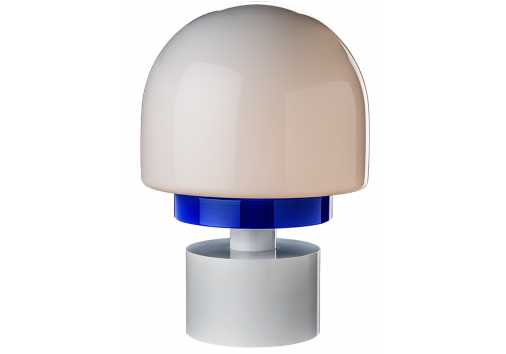 Darpanah firmata da Ettore Sottsass per Venini è una lampada da tavolo a LED dimmerabile, con diffusore in vetro soffiato color lattimo e zaffiro. La base è in metallo laccato bianco. Edizione numerata per anno.