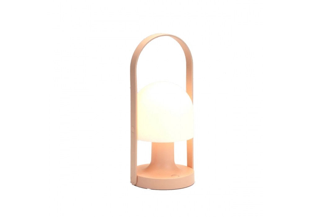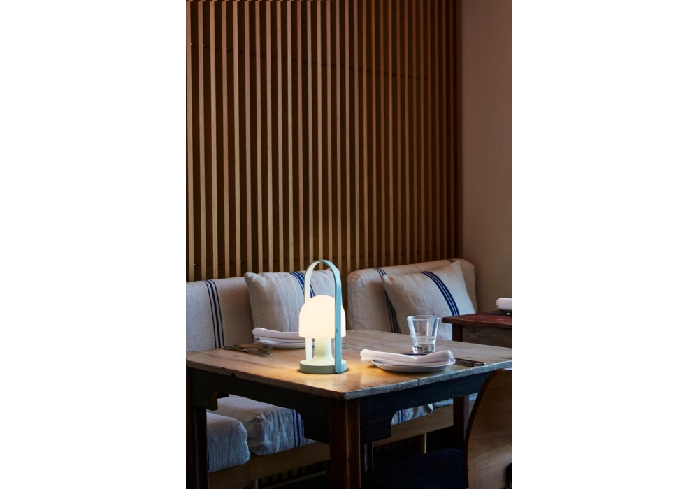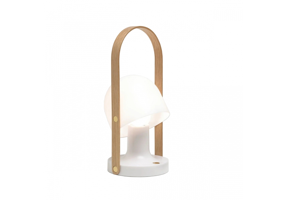 FollowMe firmata da Inma Bermúdez per Marset è una lampada da tavolo portatile con diffusore in policarbonato opalino, corpo in policarbonato e manico in multistrato.