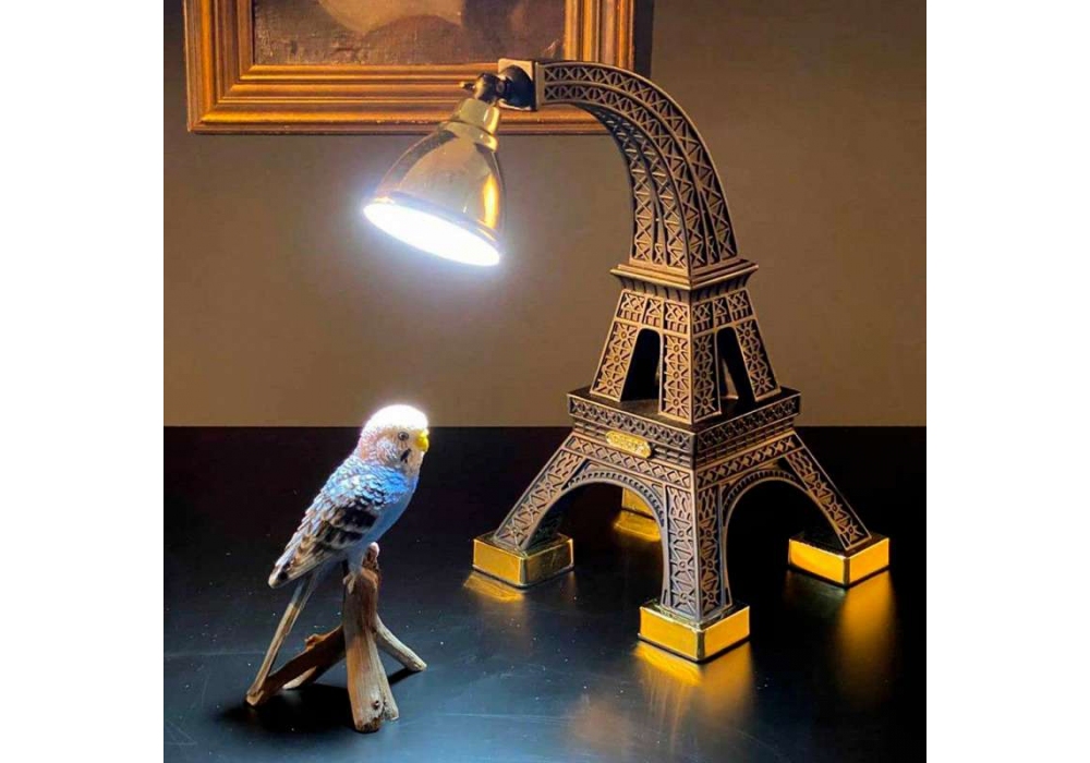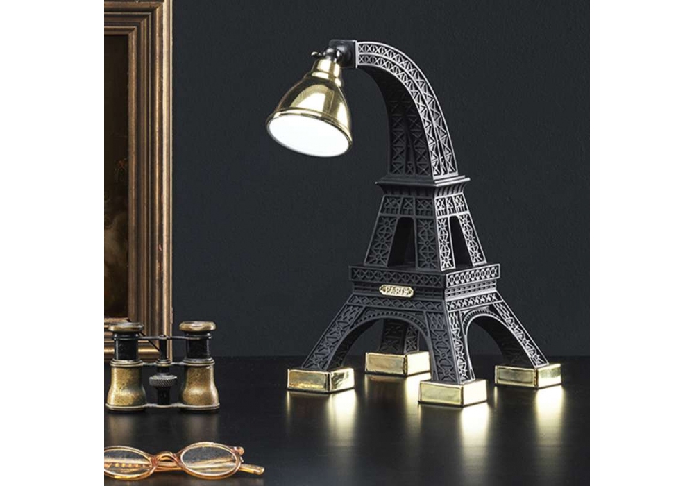 Paris XS firmata da Studio Job per Qeeboo è una lampada da tavolo verniciata di colore nero con diffusore a cupola orientabile in ottone.