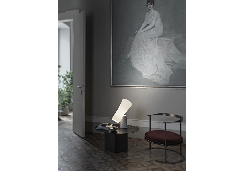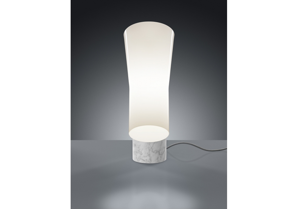 Nile firmata da Rodolfo Dordoni è una lampada da tavolo con base cilindrica in marmo bianco di carrara o nero marquina. Il diffusore è in vetro soffiato incamiciato di colore bianco e scherma una sorgente luminosa di tipo LED retrofit dimmerabile.