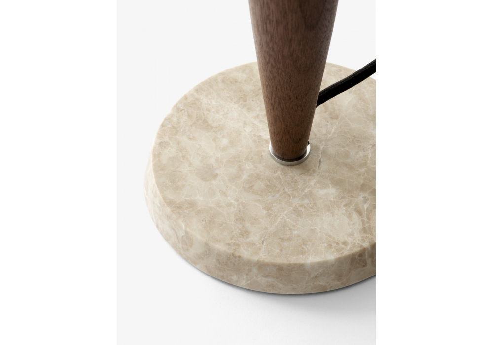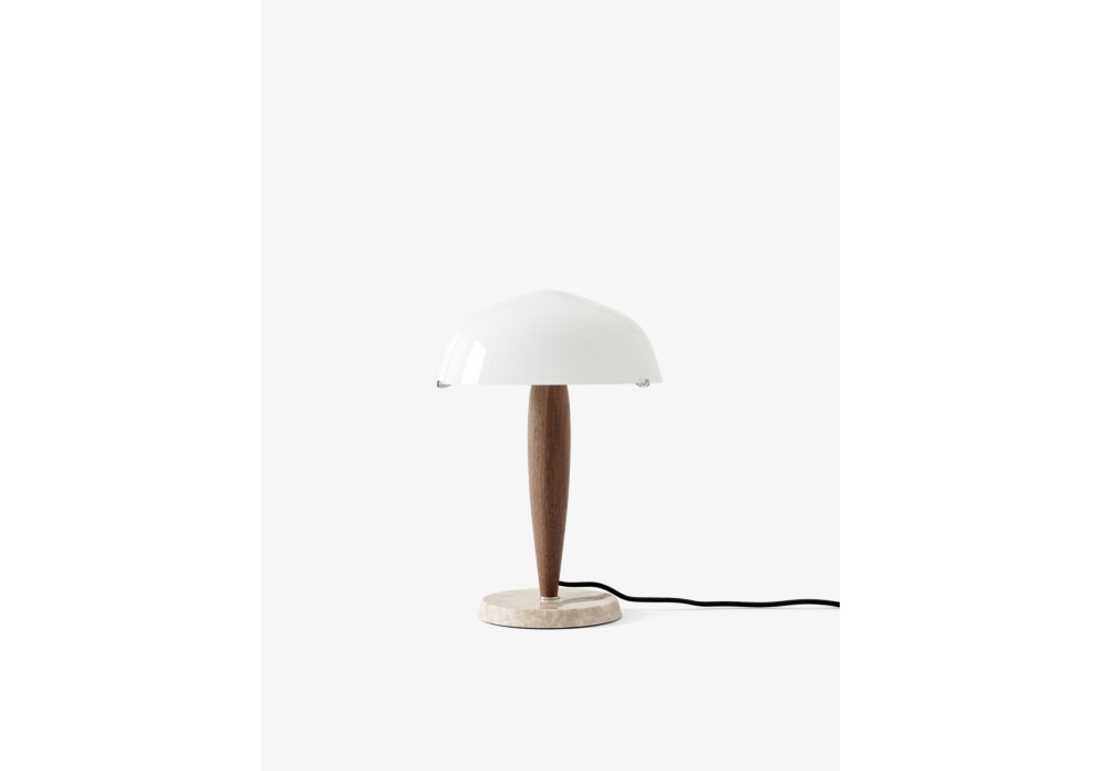 Herman firmata da Signe Hytte per &Tradition è una lampada da tavolo caratterizzata da un paralume in vetro opale, stelo in legno e base in marmo.