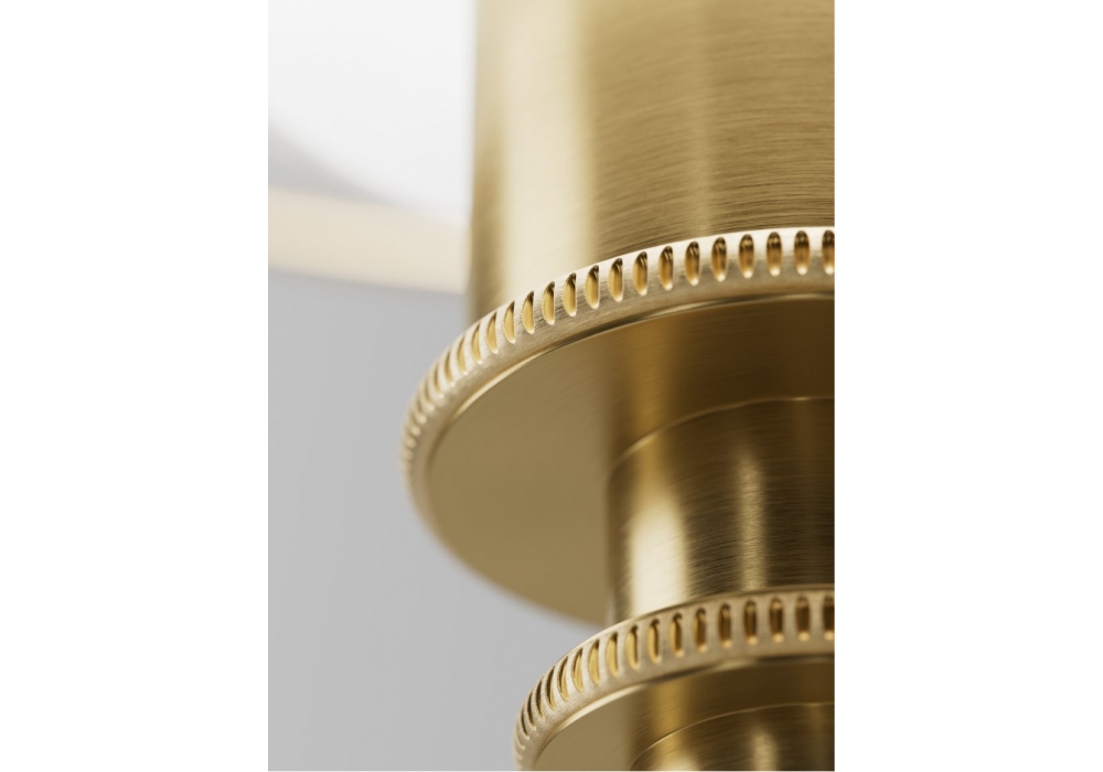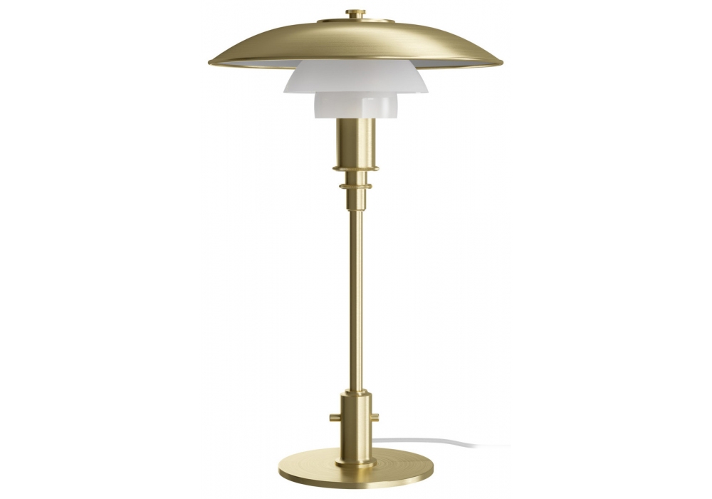 PH 3/2 firmata da Poul Henningsen per Louis Poulsen è una lampada da tavolo con struttura realizzata interamente in ottone spazzolato. Gli schermi riflettenti di forma circolari sono strutturati in vetro soffiato opalino e filtrano una sorgente luminosa di tipo LED o alogena.