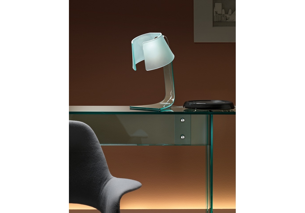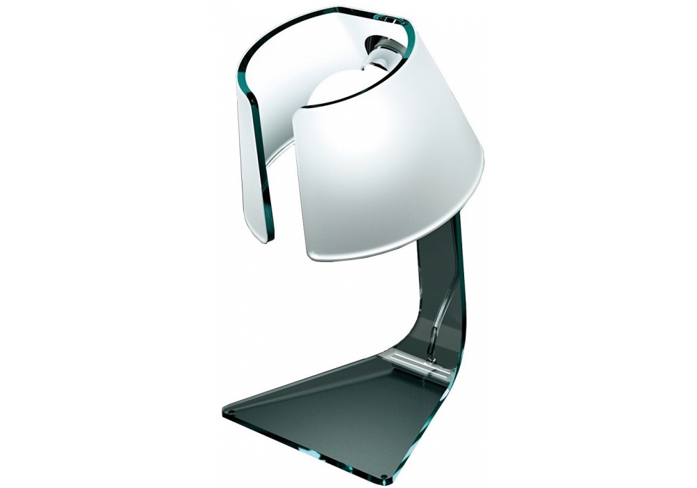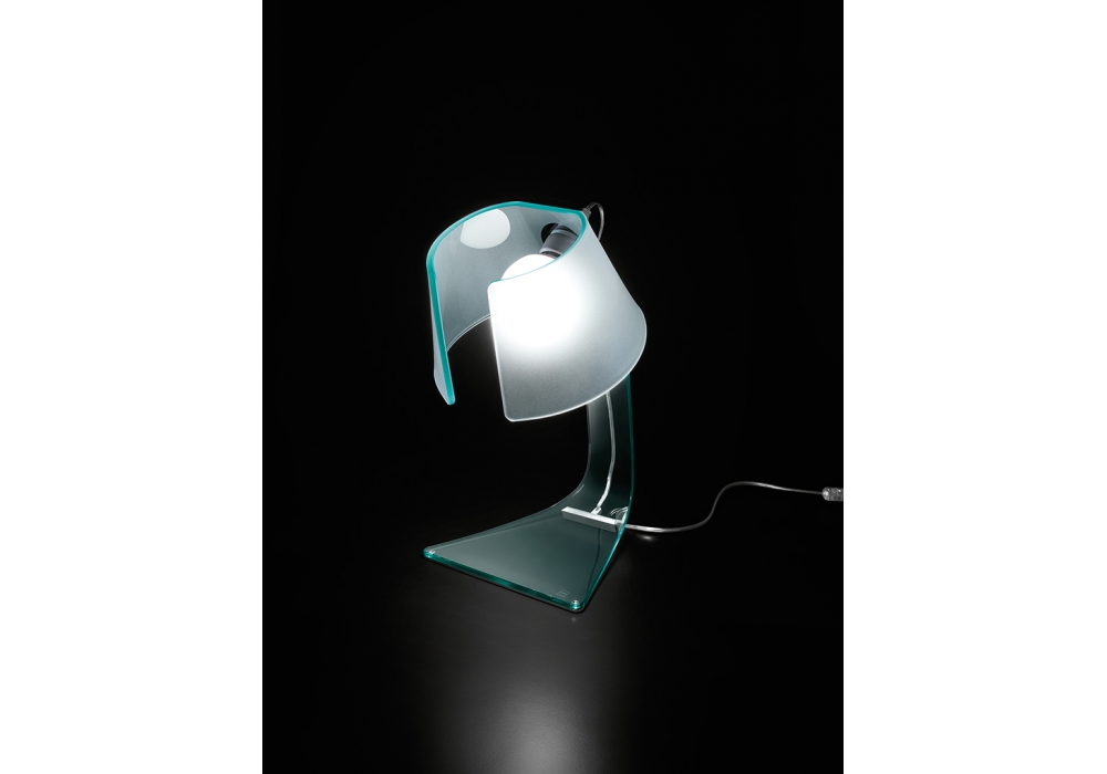 L'astra firmata da Lo Bianco-Mansueto per Fiamo è una lampada da tavolo realizzata in vetro trasparente curvato e portalampada in alluminio brill.