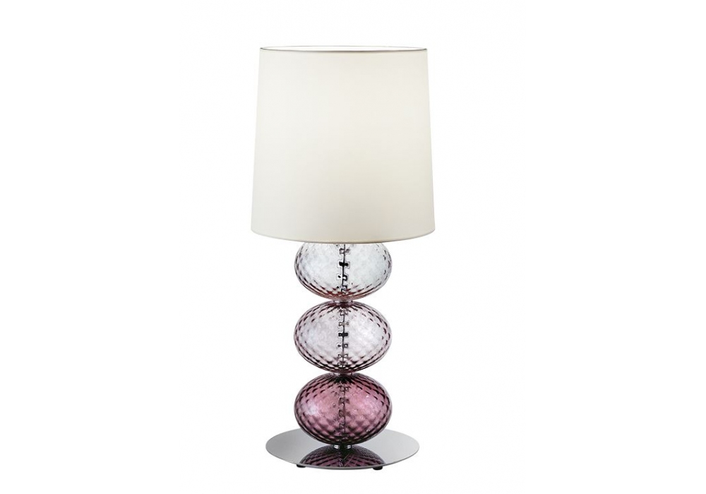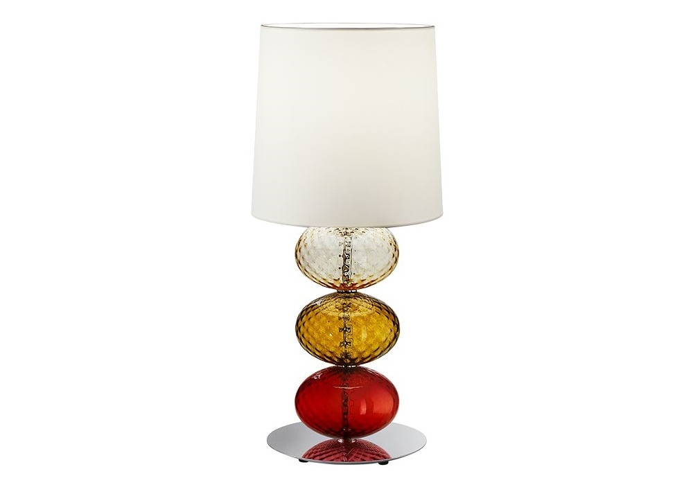 Abat-Jour 803.00 firmata e prodotta da Venini è una lampada da tavolo con paralume in tessuto bianco e struttura in metallo cromato, impreziosita da 3 perle in vetro soffiato con lavorazione balloton. Disponibile in 2 combinazioni di colore.
