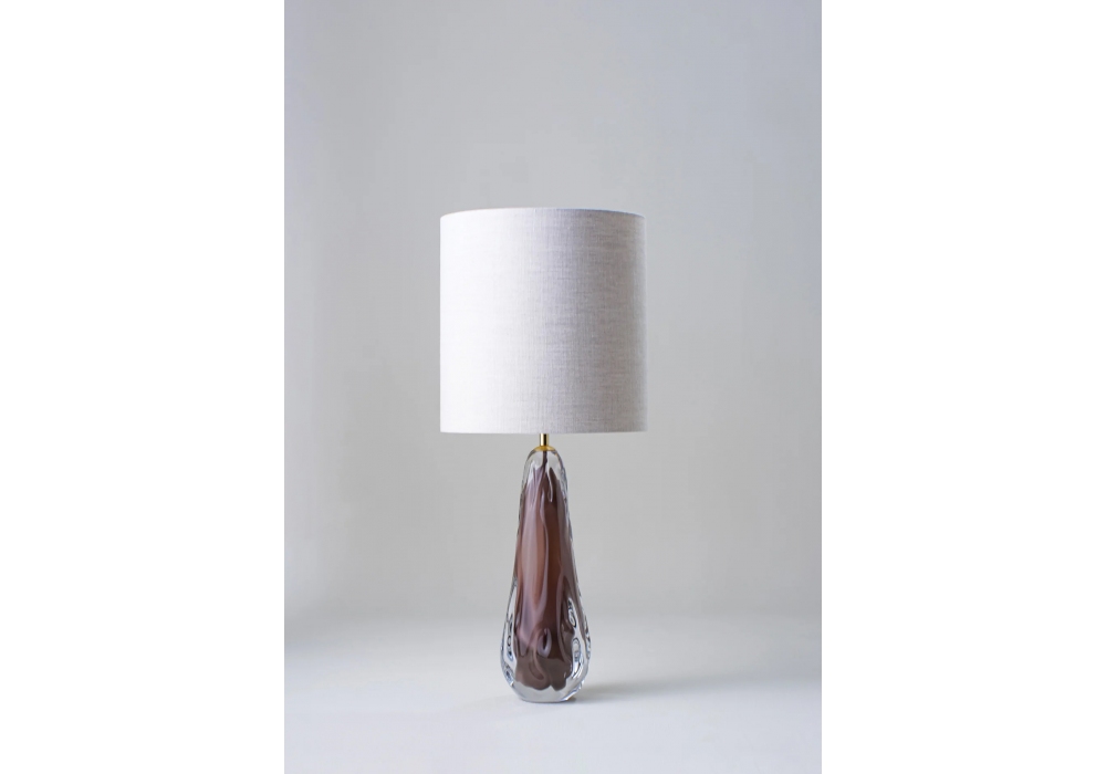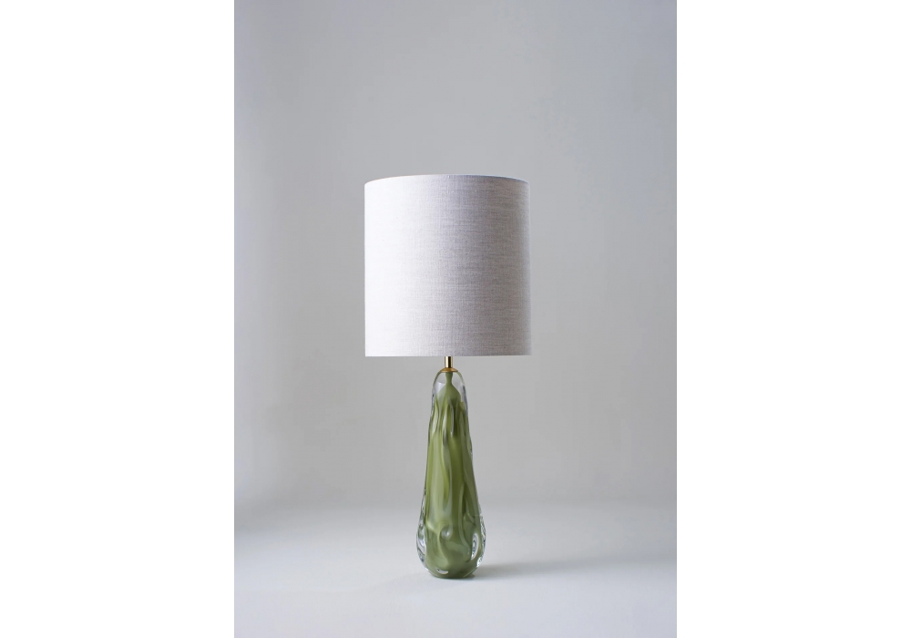 Avocado Large firmata e prodotta da Porta Romana è una lampada da tavolo strutturata in vetro soffiato ed ottone patinato. Il paralume è in tessuto e scherma una sorgente luminosa con innesto E27 di tipo LED alimentata da un cavo in fibra tessile. Avocado Large è disponibile in differenti finiture per ogni singolo elemento.