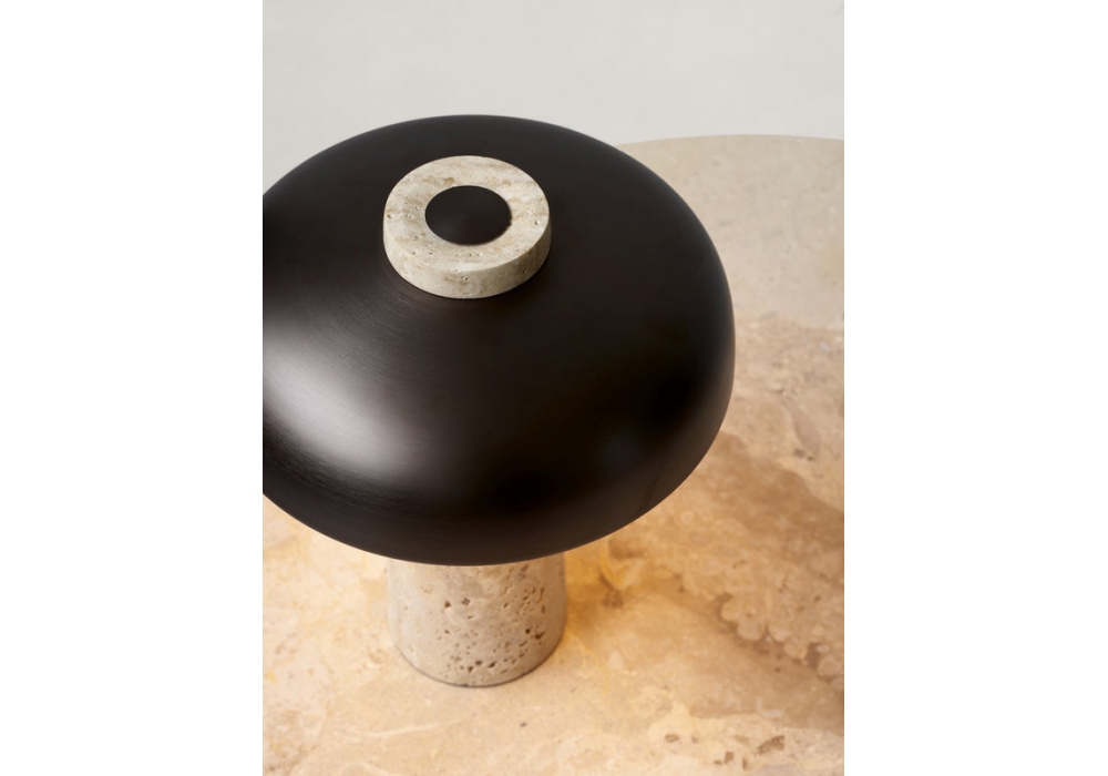 Reverse firmata da Aleksandar Lazic per Audo Copenhagen è una lampada da tavolo con base in travertino e diffusore in alluminio nella finitura ottone bronzato.