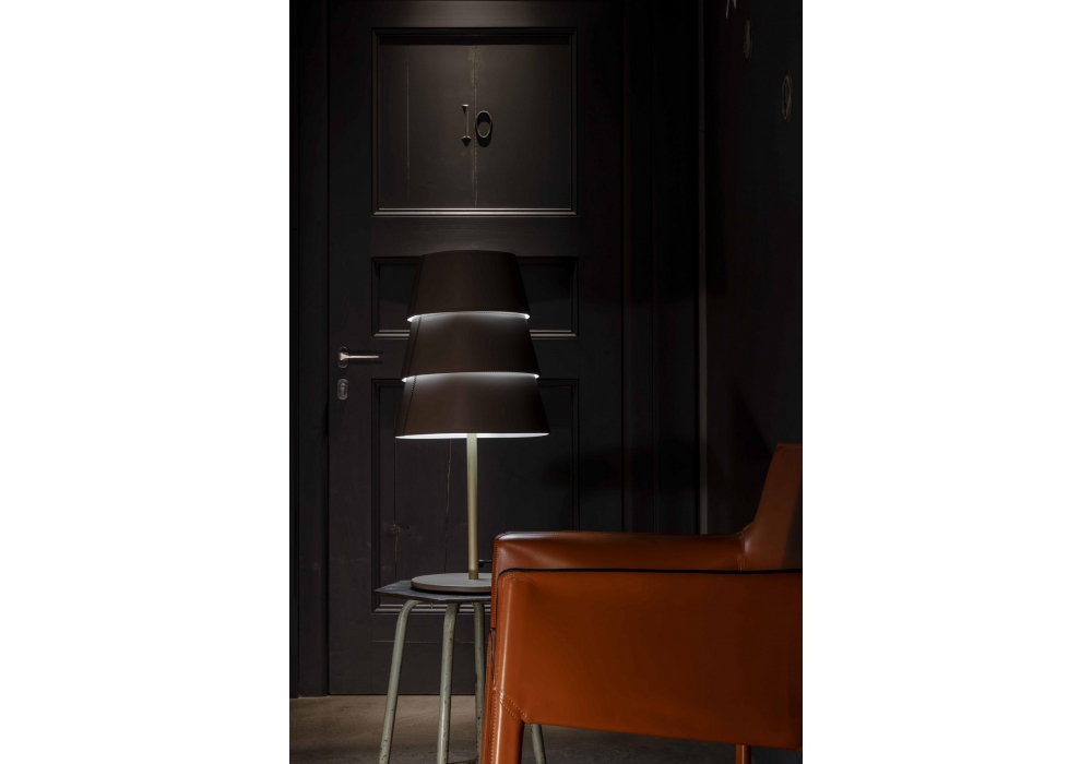 Tulip firmata da Stefano Santilio per Enrico Pellizzoni è una lampada da tavolo in ottone satinato o verniciato bianco. Base circolare in metallo, diffusore ed anelli rivestiti in cuoio, disponibili in diversi colori.