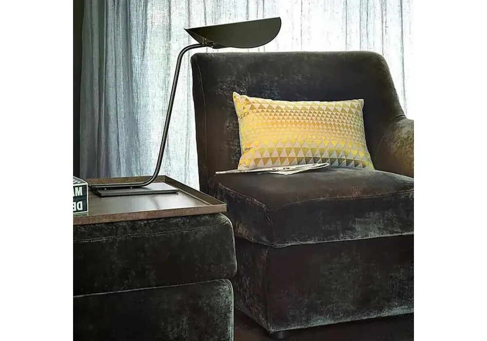 Plume firmata da Christophe Pillet per Oluce è una lampada da tavolo con base quadrangolare e asta tubolare ricurva in metallo verniciato bronzo. Il diffusore è in metallo e scherma una sorgente luminosa.