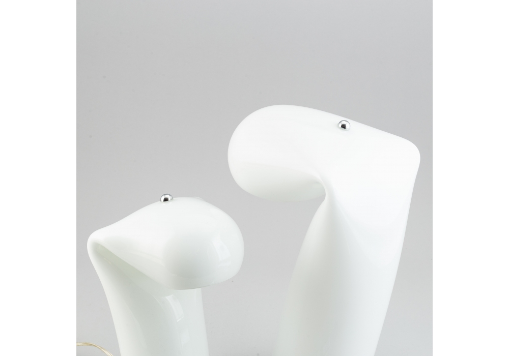 Bissa firmata e prodotta da Vistosi è una lampada da tavolo interamente strutturata in vetro artigianale di colore bianco lucido. La sorgente luminosa adottata è con innesto G9 di tipo LED o alogeno con switch on/off su cavo di alimentazione.