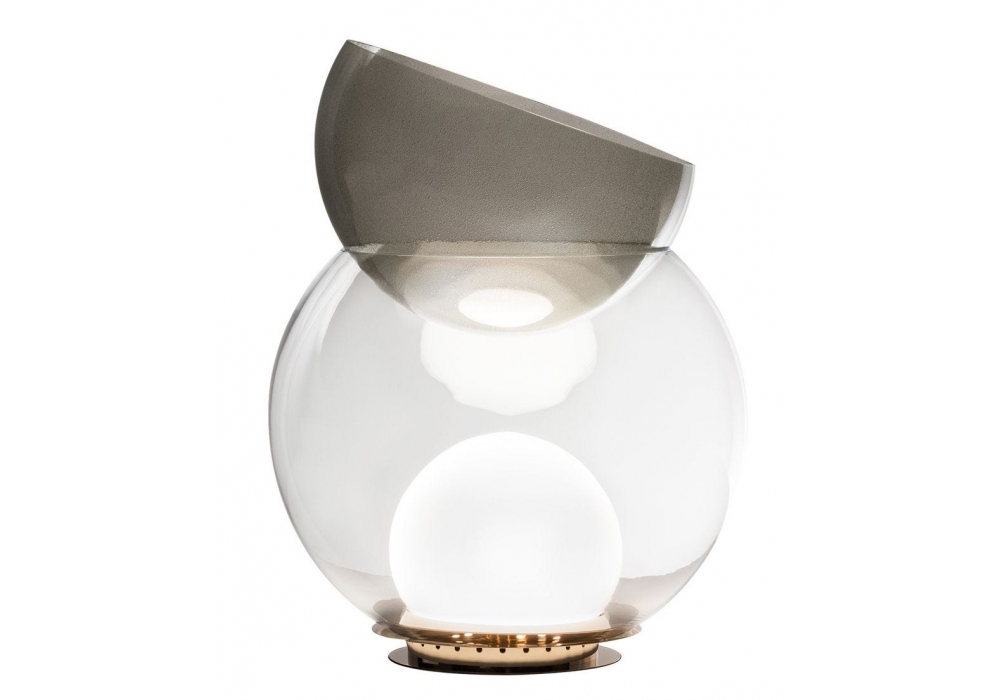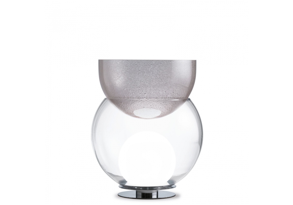 Giova firmata da Gae Aulenti per Fontana Arte è una lampada da tavolo a luce diffusa non dimmerabile con struttura in metallo cromato o galvanizzato con sfera centrale in vetro soffiato trasparente. Sfera interna in vetro soffiato bianco lucido. Semisfera superiore in vetro soffiato pulegoso trasparente colorato. Cavo di alimentazione, interruttore e spina nera. Disponibile in differenti dimensioni e finiture.