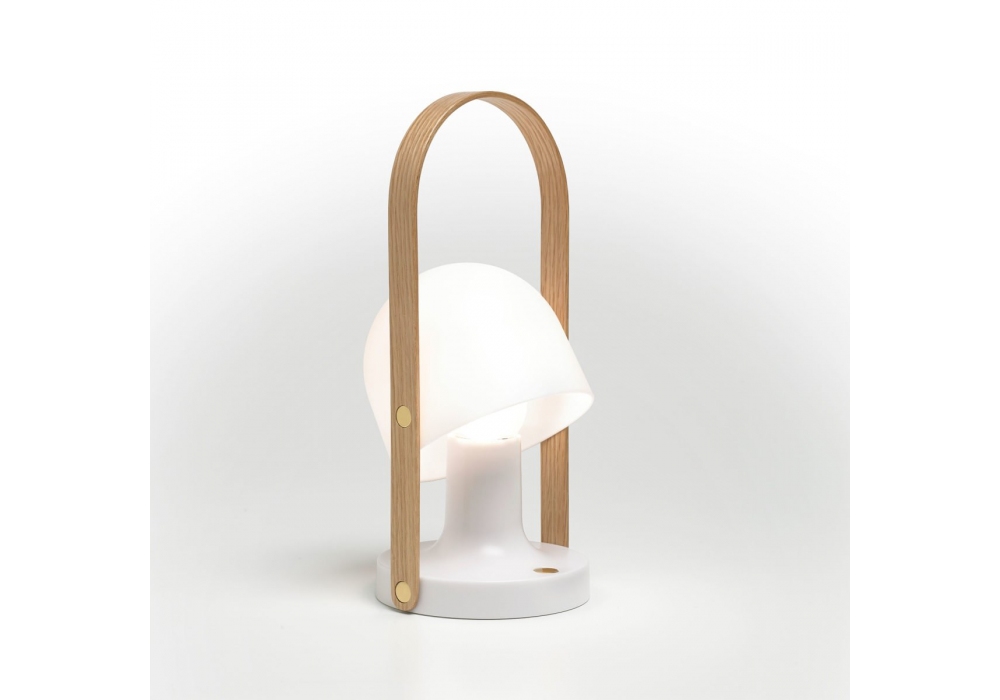FollowMe Plus firmata da Inma Bermúdez per Marset è un lampada da tavolo portatile con diffusore in policarbonato opale e manico in rovere naturale.