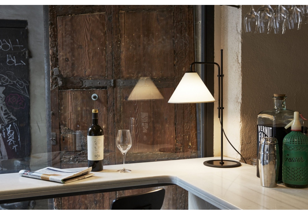 Funiculì S Fabric firmata da Lluís Porqueras per Marset è una lampada da tavolo con base e stelo in ferro verniciato nero e paralume in poliestere bianco o sabbia.