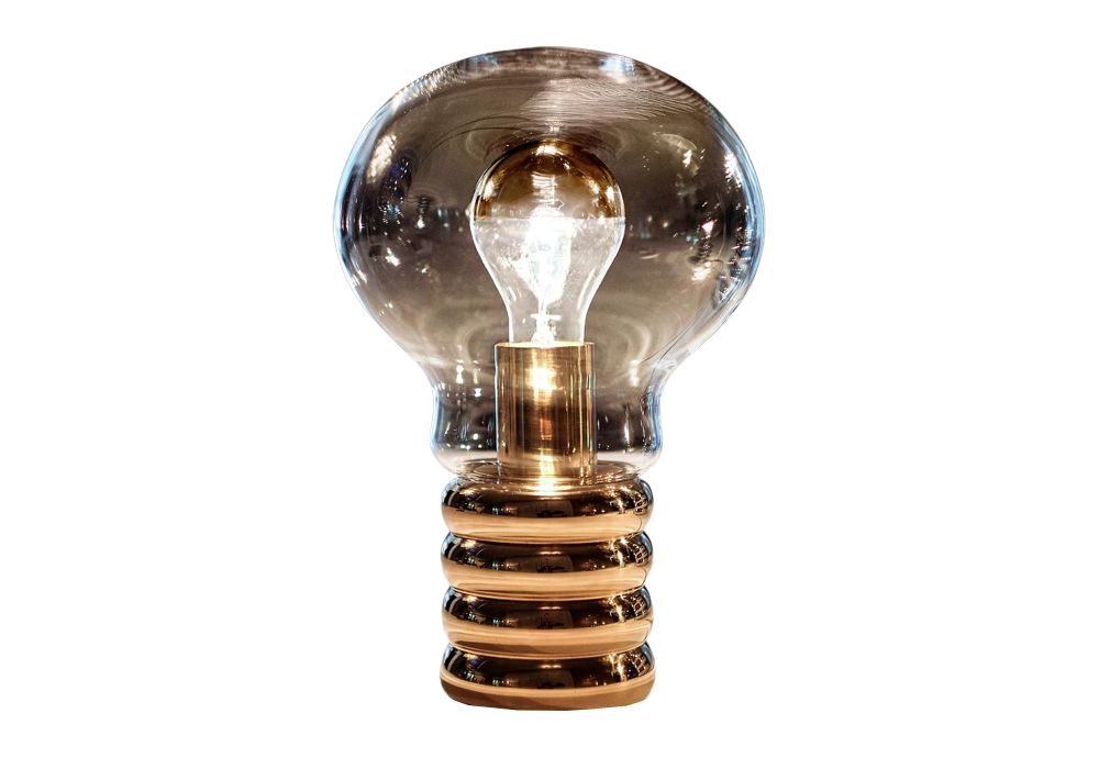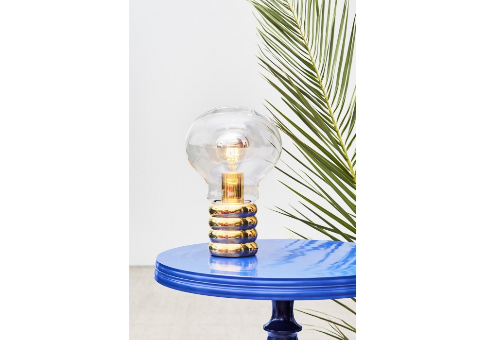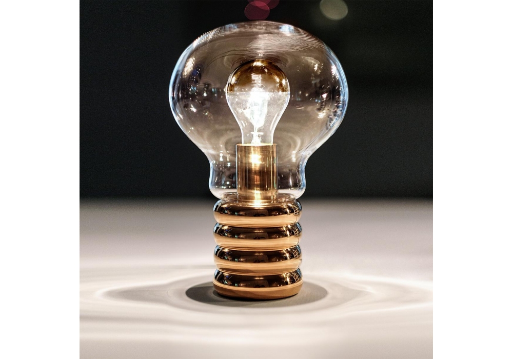 Bulb Brass firmata e prodotta da Ingo Maurer è una lampada da tavolo con base in ottone e diffusore in cristallo soffiato a Murano. La lampadina interna è a LED con cupola in ottone.
