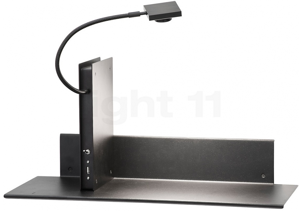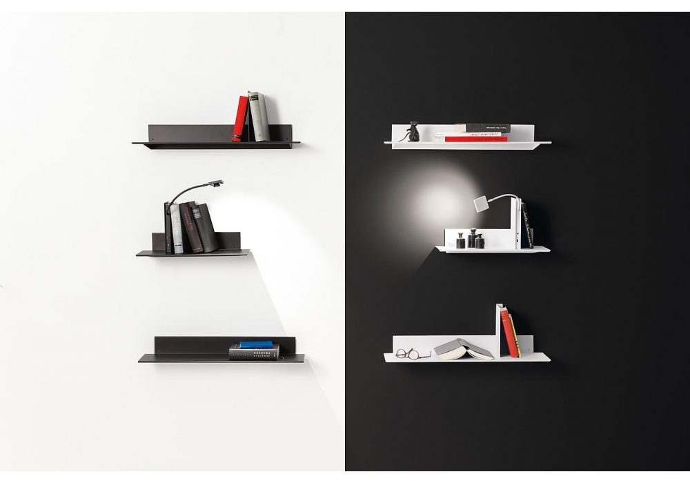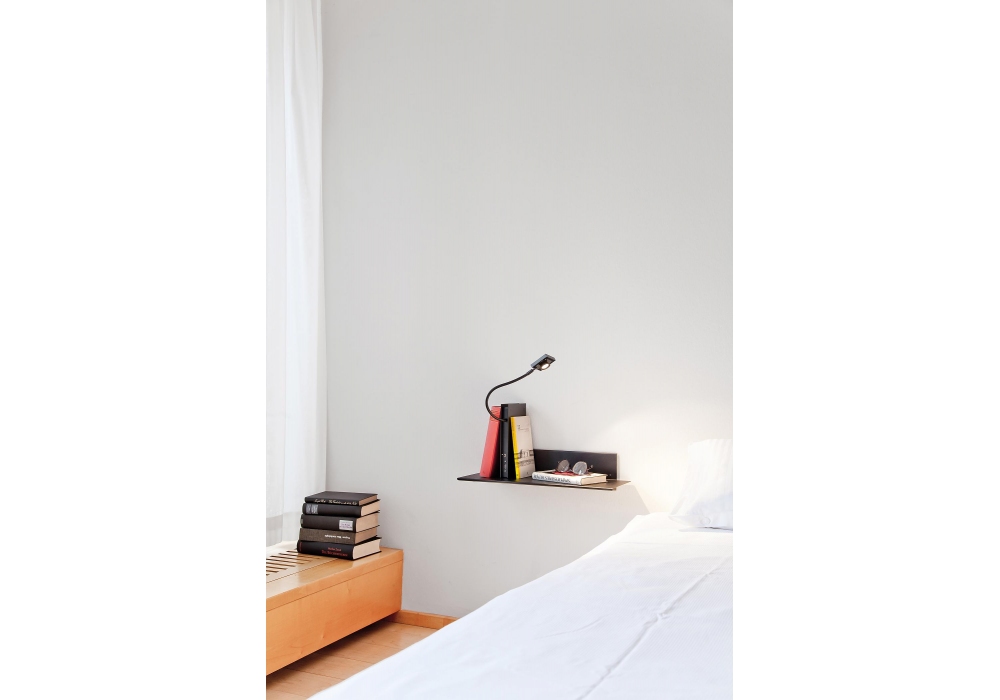 Oskar on the Shelf firmata e prodotta da Ingo Maurer è una lampada da tavolo che può essere fissata al muro. E' dotata di un collo di cigno regolabile e flessibile, che consente al modulo luminoso di essere collocato in più direzioni. La struttura è in metallo verniciato a polvere, in 2 finiture.