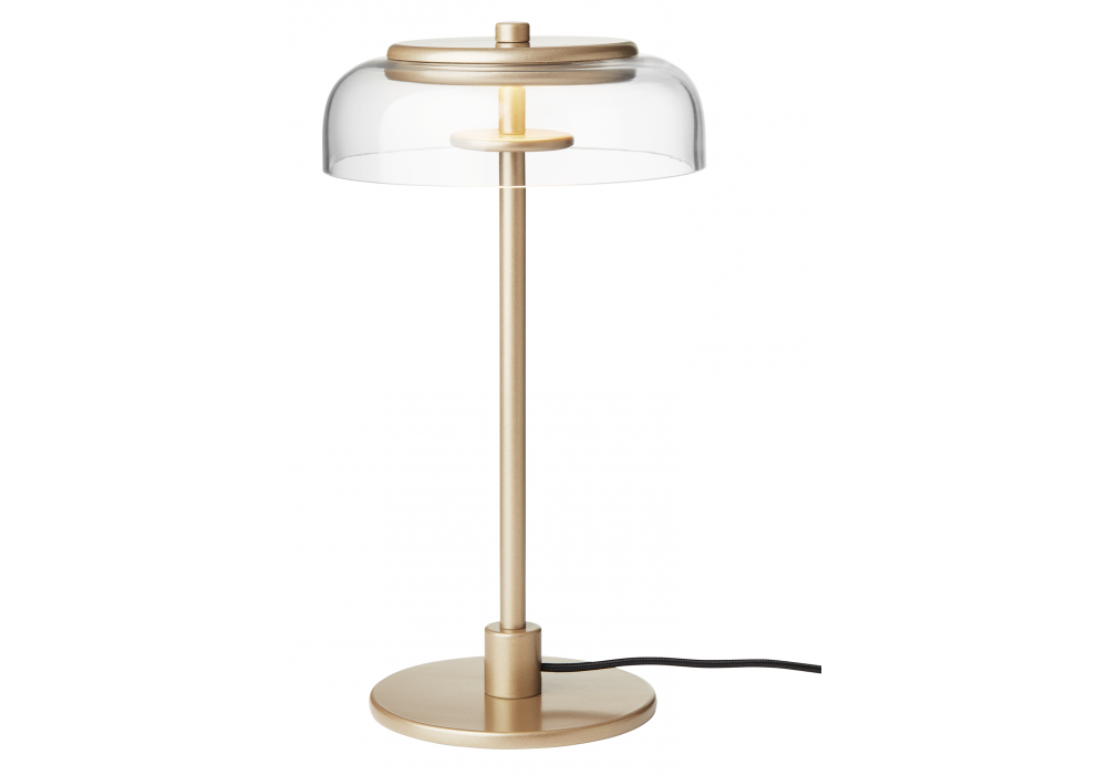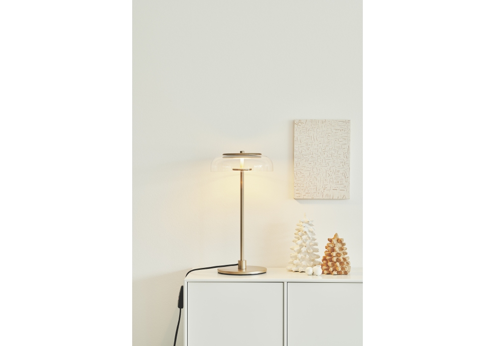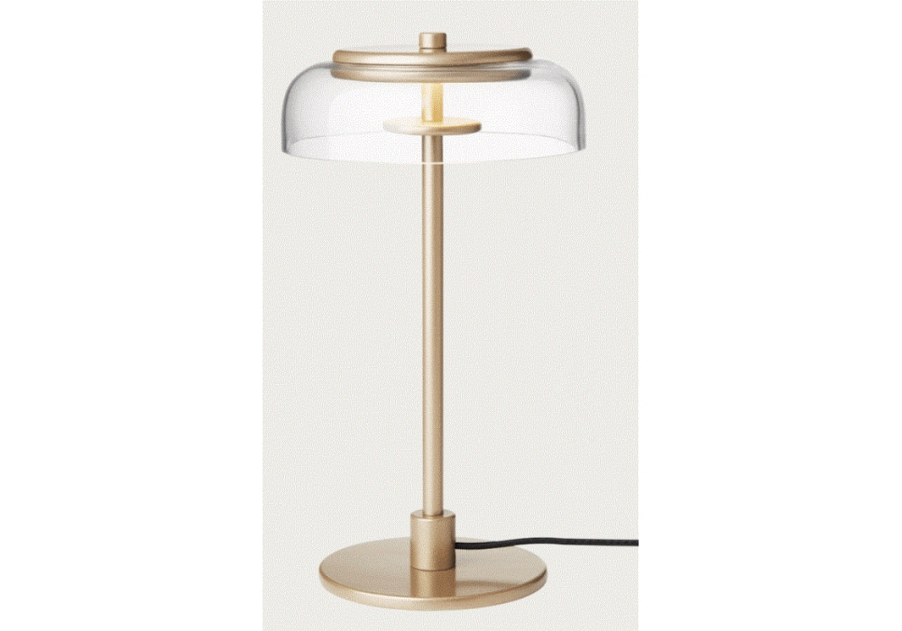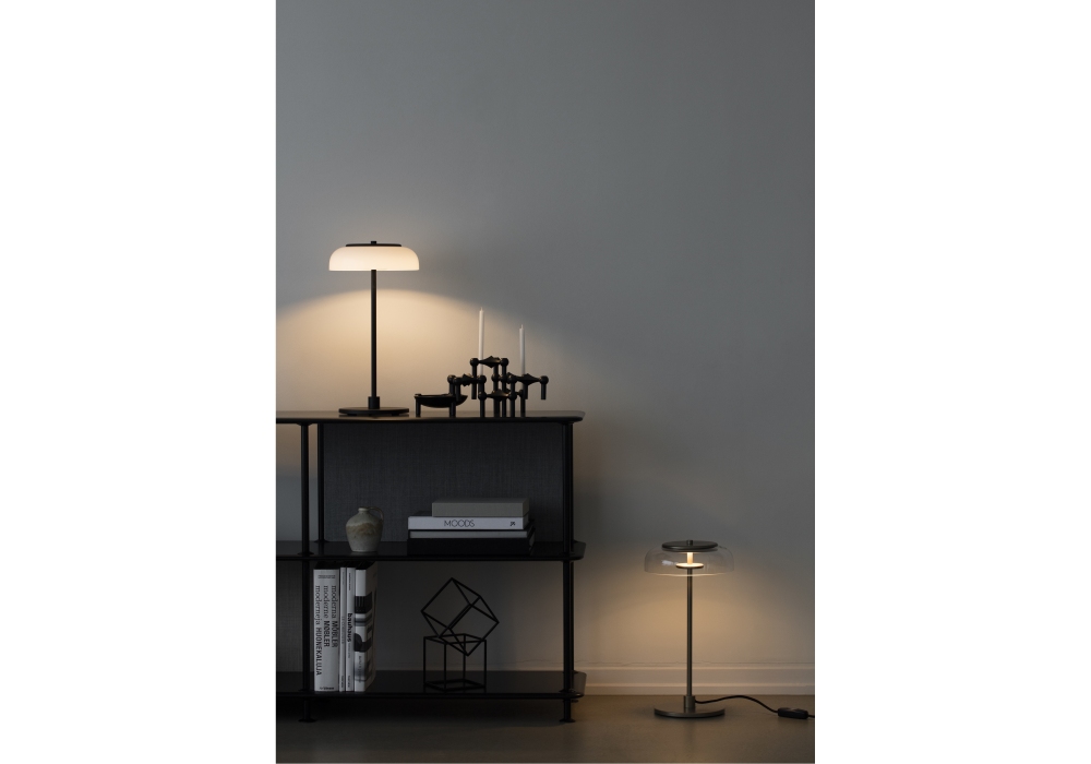 Blossi firmata da Sofie Refer per Nuura è una lampada da tavolo con paralume in vetro opalino e base in metallo nero o con paralume trasparente e base in metallo oro nordico. Cavo con dimmer e spina.