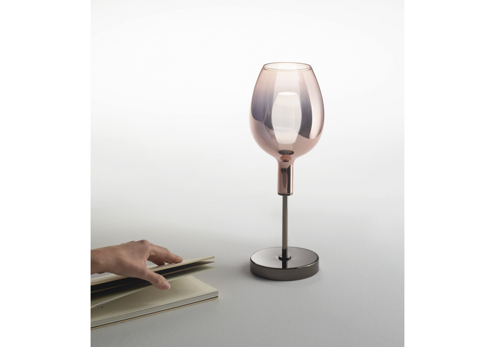 Rosè firmata da Danilo De Rossi per Italamp è una lampada da tavolo LED con struttura in metallo e diffusore in vetro metallizzato lucido. Cavo alimentazione usb incluso.