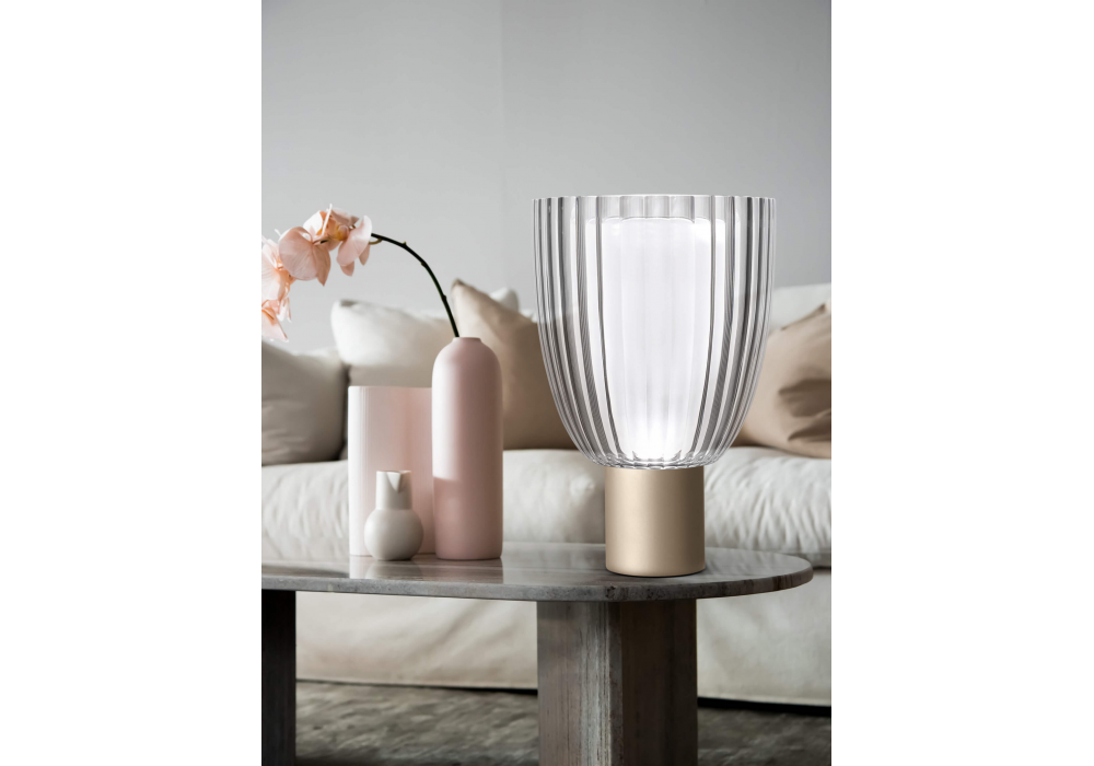Universale firmata da Virginia Cei per Italamp è una lampada da tavolo in cristallo intagliato con diffusore interno in vetro soffiato e satinato. Base in metallo in finitura champagne opaco, bronzo opaco o nero opaco.