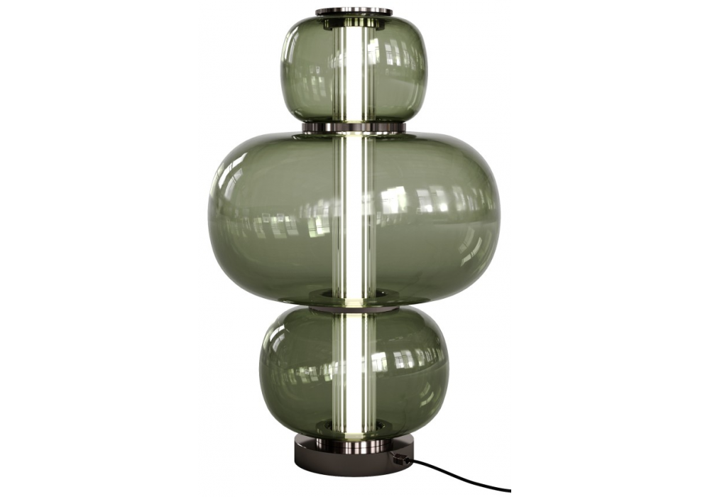 Nube firmata da Defne Koz e Marco Susani per Italamp è una lampada da tavolo in vetro di Murano, composta da tre volumi in differenti finiture. Il diffusore interno è in cristallo inciso. Struttura in metallo canna di fucile.