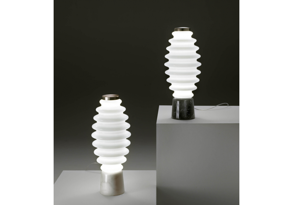 Grand Collier firmata da Marc Sadler per Italamp è una lampada da tavolo con diffusore in vetro soffiato bianco e base in marmo calacatta oro o nero marquina. Parti metalliche con finitura canna di fucile.