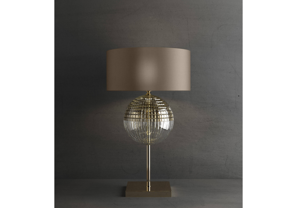 Brigitta firmata e prodotta da Italamp è una lampada da tavolo con struttura in metallo oro nichel, corpo sferico in cristallo intagliato trasparente e teak con diffusore in tessuto in finitura tortora.
