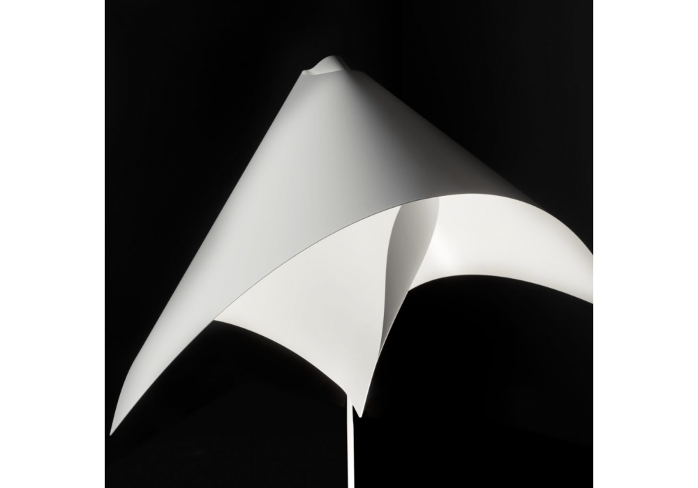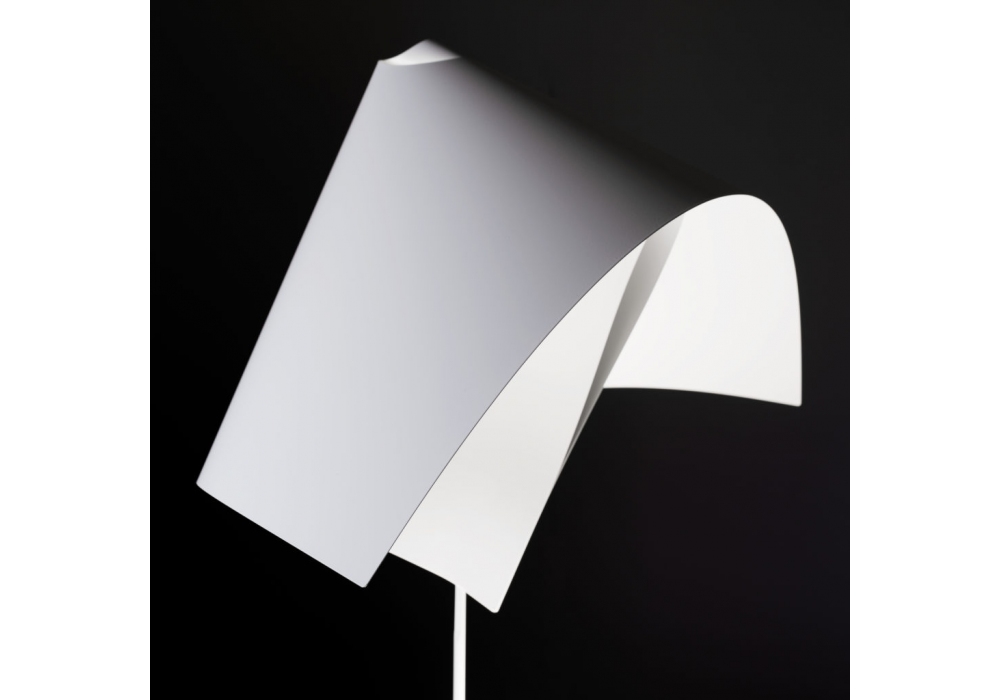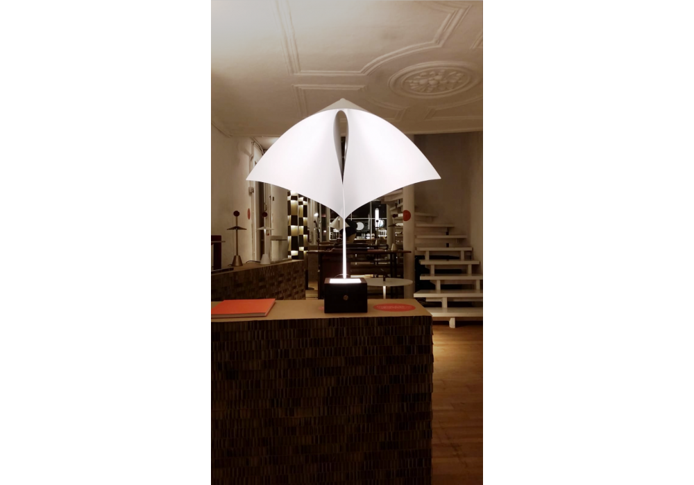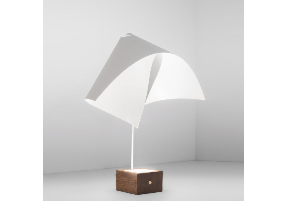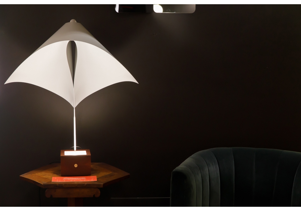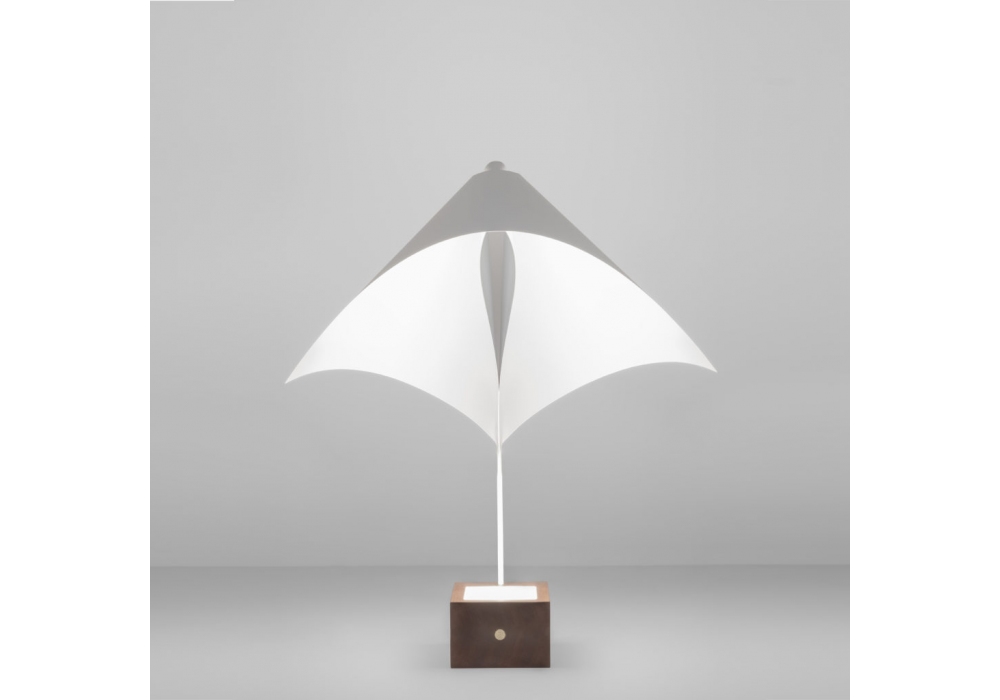 Badessa firmata da Michele Reginaldi per Firmamento Milano è una lampada da tavolo a luce indiretta realizzata con base in mogano massello e diffusore in acciaio verniciato bianco.