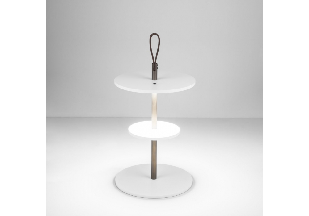 Servoluce firmata da Park Associati per Firmamento Milano è una lampada da tavolo a luce indiretta realizzata con struttura in alluminio verniciato, stelo in ottone e maniglia in cuoio.