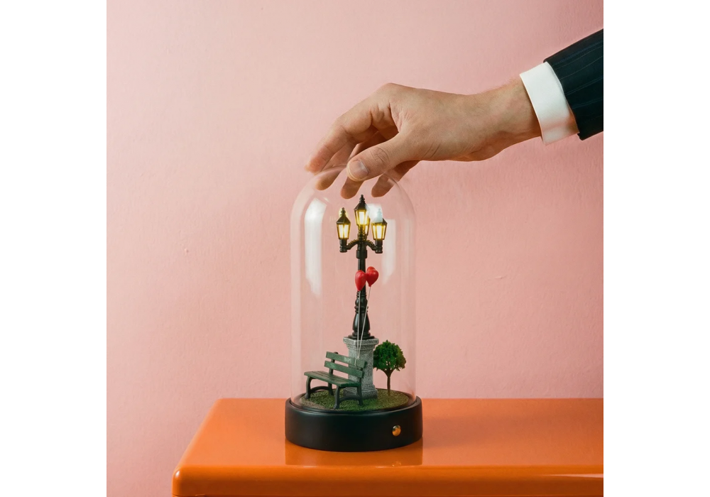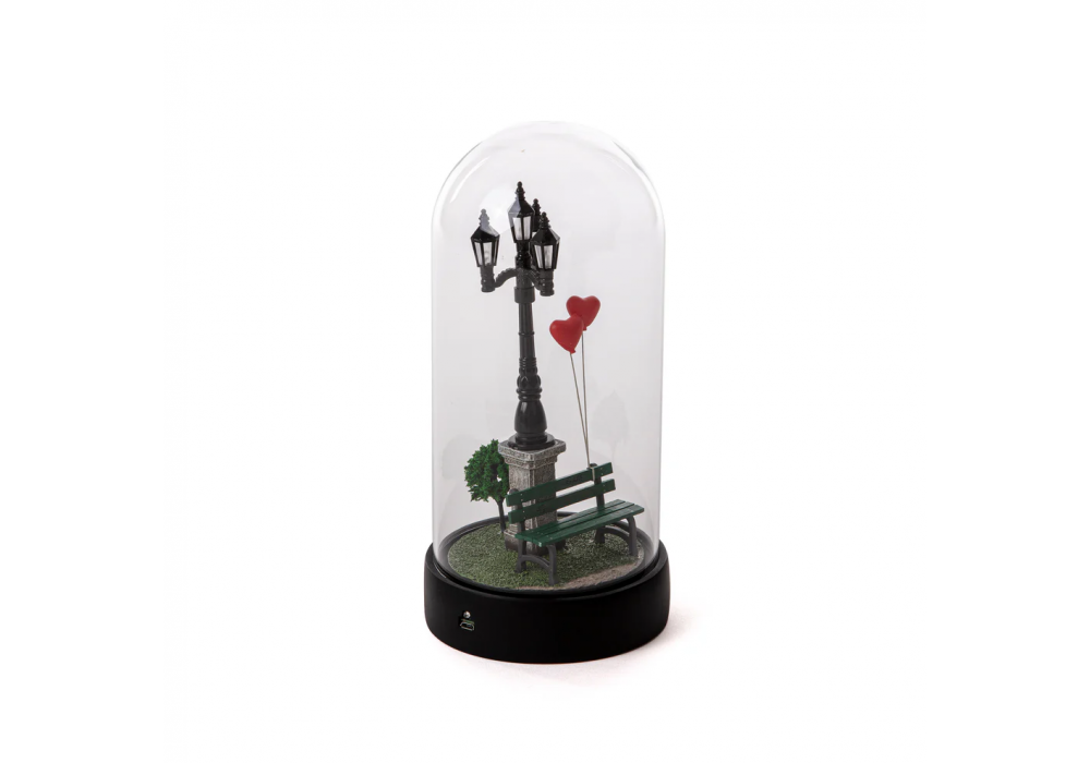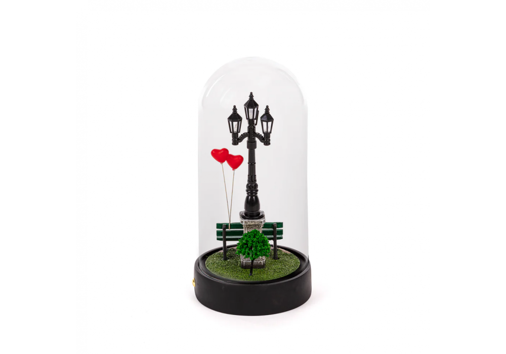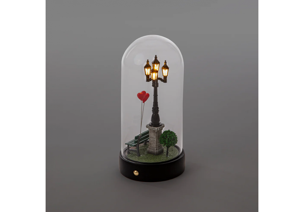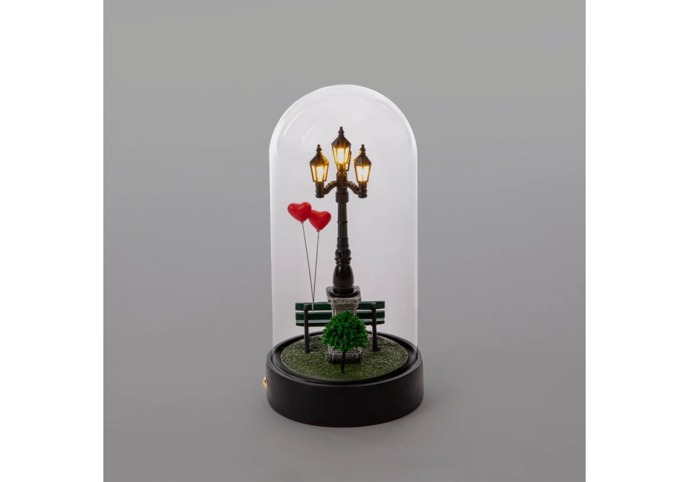 My Little Valentine firmata da Marcantonio per Seletti è una lampada da tavolo con base circolare in resina con la rappresentazione di un piccolo diorama. La campana di protezione è in vetro ed adotta una sorgente luminosa di tipo LED con sistema di dimmerabilita alimentata da un cavo USB.